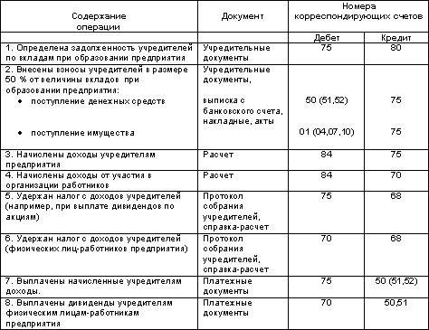 Фактически внесенные вклады учредителей отражают по дебету соответствующих материальных, денежных и других счетов (01,04,10,50,51,52) и кредиту счета 75-1.