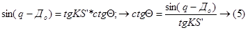 Опустим на сторону О’Р сферический перпендикуляр KS’. Обозначим склонение этого перпендикуляра через q, тогда KP=90-q; O’P=90- До; O’K=q- До. Из прямоугольного треугольника O’KS’ по правилу Непера, получим: