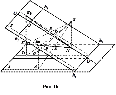 Точка схода изображений вертикальных (отвесных) прямых совпадает с точкой надира n (рис. 16). Пересечение Bo отрезка АВ с плоскостью снимка находится на следе вертикальной плоскости, проходящей через прямую АВ и параллельной плоскости главного вертикала,. Поэтому отрезок NBo есть изображение бесконечного отвесного луча, идущего из точки Bo. Проекции точек А и В принадлежат этому отрезку, значит для их построения достаточно провести проектирующие лучи. Аналогичным образом на рис. 16 построено изображение вертикальной прямой DK. Решение задачи можно было начать и с построения точки А, которая принадлежит плоскости основания.