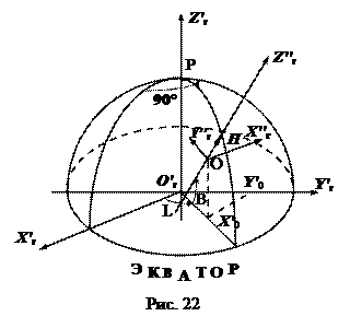 Может использоваться и прямоугольная система координат X" г Y" г Z" г, представленная на рис.22. Она сохраняет все преимущества геоцентрической системы, но абсолютные значения координат точек в ней меньше. Ось Z" г нормальна к поверхности эллипсоида в начальной точке О картографируемого участка; ось Y" г совпадает с направлением на север. Система координат правая. За начало счёта высот принимается такое значение, при котором аппликаты всех точек положительны. Координаты X" г, Y" г, Z" г, легко получаются из геоцентрических X' г, Y' г, Z' г путём трёхмерного преобразования, включающего перенос начала координат и их вращение.