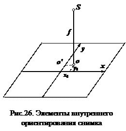 Элементы внутреннего ориентирования позволяют найти положение центра проекции относительно снимка, а значит восстановить связку проектирующих лучей, существовавшую в момент фотографирования. К ним относятся координаты главной точки x 0, y 0 снимка и фокусное расстояние f фотокамеры (рис.26).