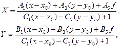Теоретическим обоснованием аналитического способа являются формулы трансформирования (40). Для вычисления по ним необходимо выполнить измерения координат x и y точек, трансформированные координаты которых требуется получить, и знать элементы внешнего ориентирования наклонного снимка. Точное их значение обычно неизвестно, поэтому трансформируют по опорным точкам (опознакам). Для определения минимального числа опознаков, воспользуемся уравнениями коллинеарности (30). При этом примем координаты центра проекции равными нулю и разделим числители и знаменатели правых частей на – c3f, в результате получим: