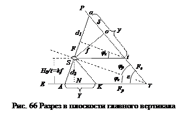 Предположим, что через отрезок Aa на рисунке проходит главная оптическая ось объектива S, а через точку схода i его главная фокальная плоскость. Известными при выборе фокусного расстояния F объектива считаются: фокусное расстояние снимка, f, его угол наклона e и коэффициент трансформирования k. В соответствии с рис. 66 можно записать: