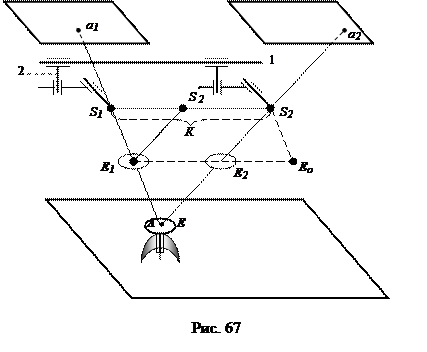 Предположим теперь, что в приборе используется не общий экран E, а для каждого снимка свой E1 и E2 , и что положение точки модели в пространстве характеризуется не пересечением проектирующих лучей, а точкой пересечения левого проектирующего луча с экраном E1. С помощью наблюдательной системы, например, оптического типа обеспечим рассматривание экрана E1 с маркой только левым глазом, а экрана E2 с маркой– только правым. Следствия таких конструктивных изменений: