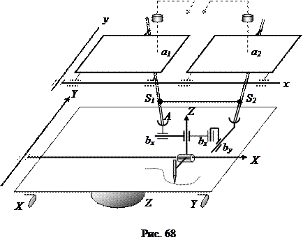 Стереоавтограф (Рис. 74) был создан специально для обработки наземных фотоснимков формата 13х18 см, полученных при нормальном и равноотклоненном случаях съемки. На нем следует немного остановиться потому, что прибор широко использовался в нашей стране при составлении маркшейдерских планов открытых горных выработок (карьеров). Его особенность в том, что используются две пары ленкеров: нижняя L1 и L2 решает задачу определения только плановых координат X и Y точек модели, верхняя (на рисунке показана только левая высотная линейка L1¢) - их высоты Z. Таким образом, пространственная система координат образуется двумя плоскостными системами.