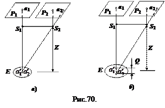 Пусть на рис. 70 S 1 и S 2 – центры проекций камер, в которые установлены снимки P 1 и P 2, составляющие стереопару. С помощью объективов S 1 и S 2 соответственные точки a1 и a2 снимков проецируются на экран Е.