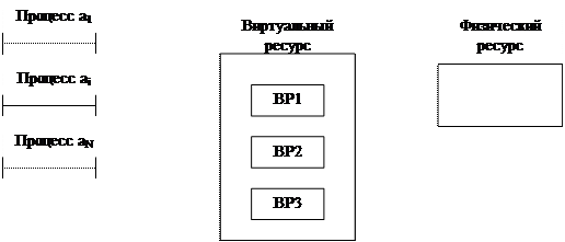 Пусть имеется совокупность процессов, каждый из которых в своем контексте содержит общий объект (процессор, буфер, принтер и др.), но в каждый момент времени его может использовать только один из процессов. В этом случае говорят, что данный объект представляет для процессов критический ресурс или процессы находятся в состоянии конкуренции за обладание ресурсом. Например, в рассмотренной схеме 2 процессор является критическим ресурсом для процессов p и q. Поставим в соответствие каждому реальному критическому ресурсу столько воображаемых копий этого ресурса, сколько имеется процессов, конкурирующих за обладание им. Каждая из этих копий называется виртуальным ресурсом. Например, для реализации выполнения процессов p и q имеем два виртуальных процессора. Введение виртуальных ресурсов позволяет перенести проблему взаимного исключения при организации доступа к соответствующим физическим ресурсам на организацию механизма выделения ресурсов.