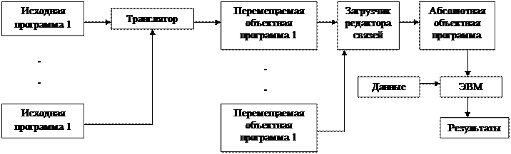 Рассмотрим более подробно режим компиляции программ. В общем случае исходная программа может состоять из нескольких составленных независимо программ. Затем на фазе загрузки и редактирования связей из множества перемещаемых объектных программ формируем абсолютную объектную программу, которая может выполняться на ЭВМ, используя необходимые данные с целью получения конечного результата.