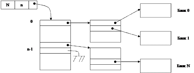 На рисунке показана схема организации с одной таблицей размещения, которая размещается в некотором целом числе блоков. Размер файлов ограничен числом блоков, дескрипторы которых содержатся в таблице. Для устранения ограничений на размеры файла и возможности вставки блоков в середину файла (если предусмотрены свободные места в таблице) применяют метод сцепленных таблиц размещений.