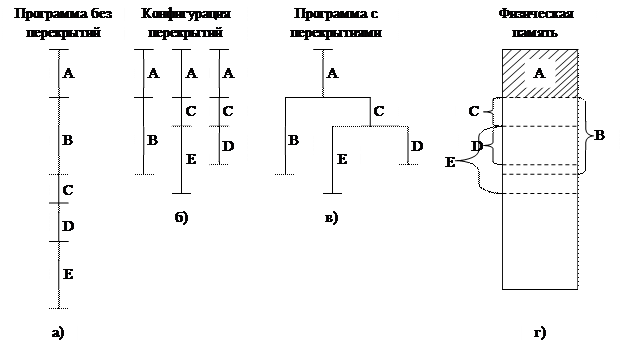 Для выполнения программ, размер которых превышает физическую память, используют метод разбиения программы на части и определения конфигурации частей, одновременно размещаемых в памяти. Эти части постоянно хранятся во внешней памяти, а загрузка их в оперативную память определяется деревом перекрытия (рис. в.). Часть программы, которая постоянно должна быть загружена в оперативной памяти (в данном случае программа A) называется резидентной. Построение дерева перекрытий необходимо выполнять таким образом, чтобы все конфигурации перекрытий могли разместиться в оперативной памяти. Выполнение программы с перекрытиями осуществляется следующим образом: подпрограмма A загружается в оперативную память и остается в ней до завершения выполнения общей программы. Подпрограммы B, C, E загружаются и выгружаются в оперативную память в зависимости от текущей конфигурации перекрытий. Например, переход от конфигурации 1) к конфигурации 2) осуществляется следующим образом: в начальном состоянии (конфигурация 1) загружены подпрограммы A и B. Осуществляется выгрузка подпрограммы из оперативной памяти и последовательная загрузка в оперативную память (на освободившееся место) подпрограмм C и E.