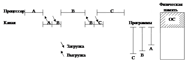 Программа хранится на диске в абсолютных кодах. При выполнении программа сначала полностью загружается в оперативную память перед выполнением следующей программы (В) предыдущая программа (А) переносится на диск. Достоинством этого метода является простота. Недостаток состоит в том, что процессор не используется во время смены выполняемых программ.