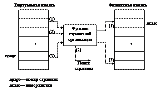 На рисунке показана общая схема страничной виртуальной памяти. Роль элемента схемы «функция страничной организации» состоит в определении соответствия между адресами страниц виртуальной памяти и адресами клеток физической памяти таким образом, чтобы страница могла быть загружена в произвольную клетку.