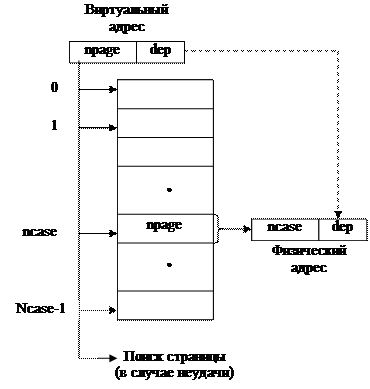 Если виртуальная страница загружена в клетку физической памяти, то ее номер (ncase) есть порядковый номер ячейки ассоциативной памяти. В противном случае происходит поиск страницы и ее загрузка в физическую память. Физический адрес определяется совокупностью параметров: номер клетки (ncase), смещение в клетке (страница) (dep). Ассоциативная память применяется на машинах с малым объемом памяти.