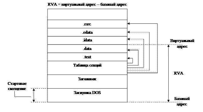 Относительным виртуальным адресом (RVA) называется смещение произвольного элемента модуля по отношению к адресу, с которого начинается отображение файла в памяти (базовый адрес).