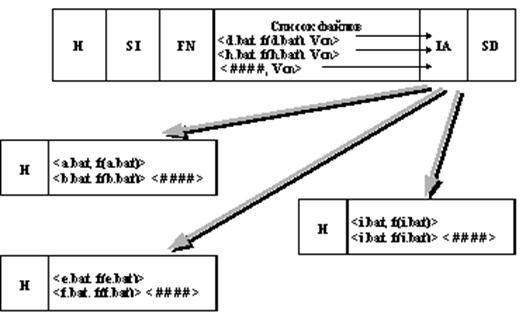 Большие списки файлов (large index). По мере того, как каталог растет, список файлов может потребовать нерезидентной формы хранения. Однако начальная часть списка всегда остается резидентной в корневой записи каталога в таблице MFT (рисунок 1.10). Имена файлов резидентной части списка файлов являются узлами B-дерева. Остальные части списка файлов размещаются вне MFT. Для их поиска используется специальный атрибут "размещение списка" (Index Allocation - IA), представляющий собой набор номеров кластеров, которые указывают на остальные части списка. Одни части списков являются листьями дерева, а другие являются промежуточными узлами, то есть содержат наряду с именами файлов атрибут Index Allocation, указывающий на списки файлов более низких уровней.