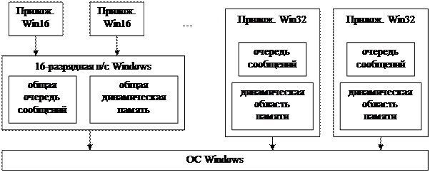 16-разрядная п/с Windows использует общую очередь сообщений и общую область кучи динамической памяти. Для 32-разрядных приложений выделяются собственные защищенные участки памяти с отдельными очередями сообщений и динамическими областями для каждого приложения.