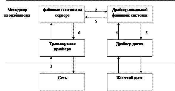 3) Для доступа к файлу драйвера локальной файловой системы обращается к низкоуровневому драйверу диска.
