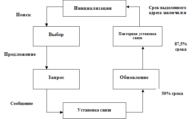 6. По мере истечения срока выделения IP адреса клиент пытается обновить выделение адреса через сервер DHCP, и если сервер не может обновить выделения IP адреса, то клиенту присваивается новый адрес.