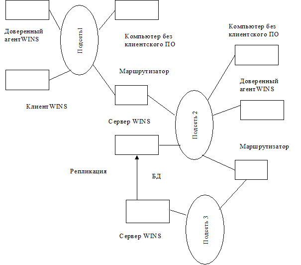 Сетевые клиенты WINS могут использовать WINS непосредственно. Компьютеры без клиентского ПО могут получать доступ к WINS через доверенных агентов. На рисунке показана иллюстрация объединенной сети, которая состоит из трех локальных сетей.