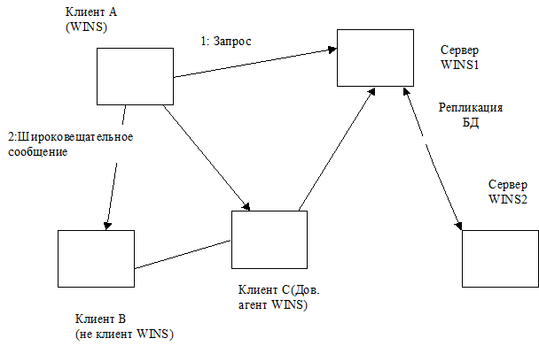 Клиент С (дов. агент) принимает широковещательный запрос и переправляет его на сервер WINS, а потом возвращает клиенту В необходимый адрес.
