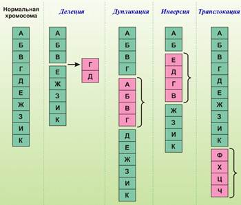 Внутрихромосомные мутации: делеция — утрата части хромосомы (АВСD ® AB); инверсия — поворот участка хромосомы на 180˚(ABCD ® ACBD); дупликация — удвоение одного и того же участка хромосомы; (ABCD ® ABCBCD);