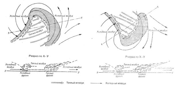 Прохождение циклона вызывает значительные и резкие изменения погоды. Последовательную смену погоды можно представить себе, если двигаться вдоль липни разреза X – Y молодого циклона в северном полушарии, когда он захватывает данный пункт наблюдения своей правой частью. Первыми вестниками приближающегося циклона являются перистые облака, быстро несущиеся с западной половины горизонта. Они появляются примерно за I–1,5 суток до прохождения центральной части циклона. Вслед за перистыми облаками идут высоко-слоистые облака, постепенно уплотняющиеся и затягивающие все небо. Далее следуют слоисто-дождевые облака с обложными осадками. Одновременно с увеличением облачности наблюдается непрерывное падение давления и усиление ветра.