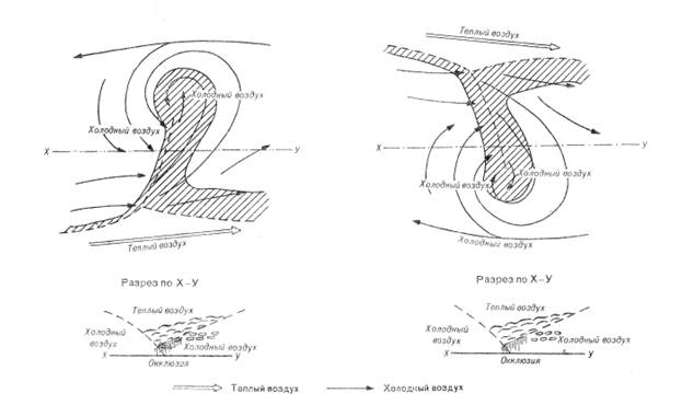 развития циклона. В этой стадии происходит смыкание холодного фронта циклона с медленно движущимся теплым фронтом. При этом теплый сектор у поверхности земли ликвидируется, а теплый воздух все более вытесняется холодным в верхние слои тропосферы. Сложный фронт, образующийся от смыкания фронтов, называется фронтом окклюзии. Если циклон окклюдируется по типу теплого фронта, то фронту окклюзии предшествуют облака и осадки теплого фронта; возможен период обложных дождей, главным образом впереди и на линии фронта окклюзии. Если циклон окклюдируется по типу холодного фронта, то короткий период сильных дождей образуется в основном позади фронта окклюзии. На фронте окклюзии изменение направления ветра аналогично изменению его на холодном фронте (рис.4).
