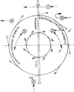 Если через некоторое время поступят новые данные о местоположении центра циклона, следует снова вычертить такой же сектор и внести необходимые поправки в меры, принимаемые для расхождения с циклоном. Направление движения центра циклона будет определяться направлением отрезка, соединяющего центры двух последних секторов.