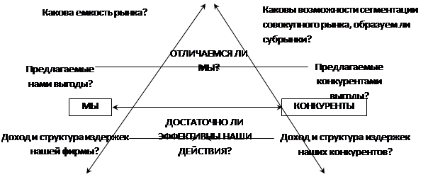 Сопоставление в рамках треугольника конкуренции емкости рынка, возможности его сегментации, выгод, предлагаемых потребителю конкурентами и внедряемым проектом, должно дать ответ на вопрос о перспективности проекта в завоевании достаточного рыночного сегмента. Более подробно вопросы изучения рынка разработчикам проекта предстоит решить в соответствующем разделе проекта. Здесь же речь идет о предварительной оценке в связи с разработкой стратегии фирмы (см. рис. 13).