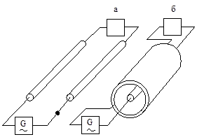 - коаксиальная цепь, представляет собой два цилиндра с совмещенной осью, причем один цилиндр — (сплошной проводник) концентрически расположен внутри другого цилиндра—полого (рисунок 5.3,б).