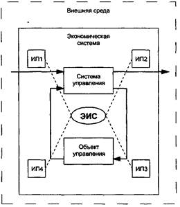Структура экономической системы (промышленного предприятия, торговой организации, коммерческого банка, государственного учреждения и т.д.) с позиций кибернетики представлена на рис. 1.1, где основные информационные потоки между внешней средой, объектом и системой управления помечены метками над стрелками ИП1, ИП2, ИПЗ, ИП4 и связаны с поддерживающей их экономической информационной системой (ЭИС).