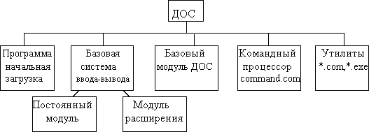 Кроме программных компонентов, указанных на рисунке, к ДОС относят еще вспомогательные файлы autoexec.bat и config.sys. Они предназначаются для настройки на конкретные режимы работы.