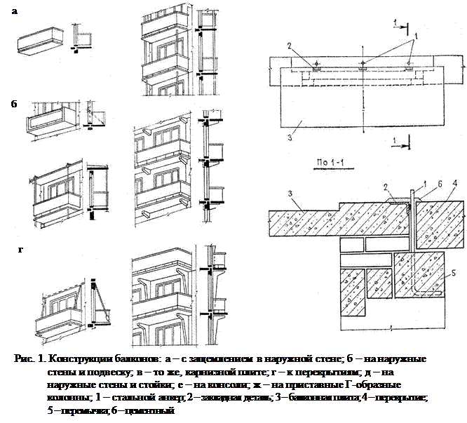 Плиту балкона проектируют как консольную или балочную с различным опиранием в зависимости от конструкции наружных стен дома и его конструктивной системы, рис. 1. Консольная плита передает на конструкции здания вертикальную реакции и опорный изгибающий момент. Восприятие этих усилий осуществляют различно в зависимости от строительной и конструктивной системы здания.