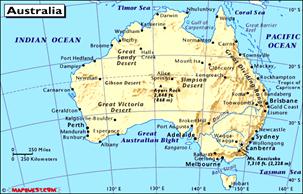 Australia is lying south-east of Asia, between the Pacific and Indian oceans. It is the world's smallest continent which is almost completely surrounded by ocean expanses. Its total area is 7,682,300 sq. km.