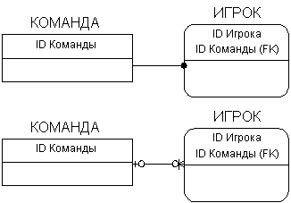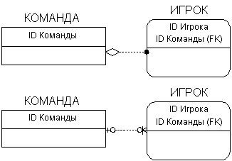 Зависимые сущности далее классифицируются на сущности, которые не могут существовать без родительской сущности (зависимость существования, existence dependent) и сущности, которые не могут быть идентифицированы без использования ключа родителя (сущности, зависящие от идентификации). Сущность ИГРОК принадлежит ко второму типу зависимых сущностей, так как ИГРОКИ могут существовать и без КОМАНДЫ.