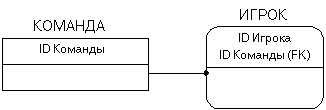 Дочерняя сущность, уникальность которой зависит от атрибута внешнего ключа, называется зависимой сущностью. В примере (рис.8) ИГРОК является зависимой сущностью потому, что его идентификация зависит от сущности КОМАНДА. В IDEF1X зависимые сущности представлены в виде закругленных прямоугольников.