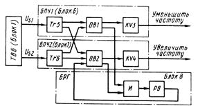 Одновременная работа блоков БПЧ1 и БПЧ2 исключается тем, что в момент опрокидывания триггера Tr5 конденсатор С2 (блок 7) перезаряжается ДР напряжения 12 В с обратной полярностью по цепи: (+)12 В – Rсм2 – Rб4 – C2 – R4 (блок 7) – Rк2 (блок 6) – (-) 12 В. Поэтому включение триггера Tr6 не приведет к включению реле KV4. Кроме того, одновременное включение реле исключается применением размыкающих контактов одного реле в цепи питания катушки другого.