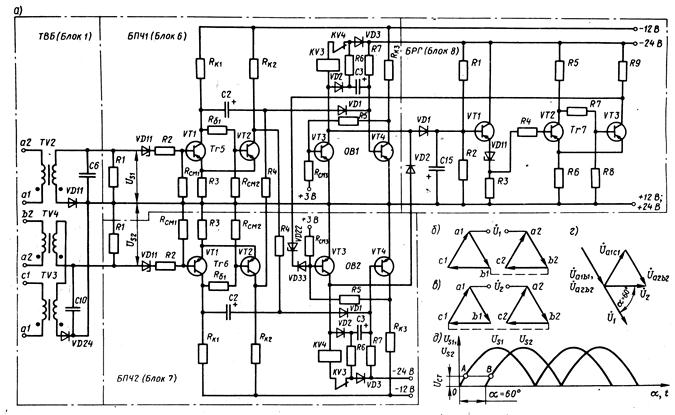 Для управления блоками используются напряжения огибающей Us1 и Us2, полученные при помощи трансформаторов TV2, TV3 и TV4. К первичной обмотке трансформатора TV2 приложено напряжение биения Ua1a2. Напряжение вторичной обмотки TV2 выпрямляется диодом VD11 и фильтруется конденсатором С6. Полученное таким образом напряжение Us1 подается на вход блокаБПЧ1. К первичным обмоткам трансформаторов TV3 и TV4 приложены соответственно напряжения Uв2a2. и Uс1a1. Вторичные обмотки этих трансформаторов включены последовательно для получения напряжения биения U2= Uс1a1 + Uв2a2, которое выпрямляется диодом VD24 и фильтруется конденсатором С10 и подается на вход блока БПЧ2. Напряжения Us1 и Us2 сдвинуты по фазена угол 60°.