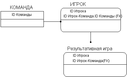Роли передаются посредством связи, также, как и другие атрибуты. Например, предположим, что мы расширили пример для того, чтобы показать какие ИГРОКИ забивали голы в различных матчах в сезоне. Имя роли “Игрок-команда-id” передается в сущность РЕЗУЛЬТАТИВНАЯ ИГРА (вместе с любым другим первичным ключом из родительской сущности), как показано ниже.