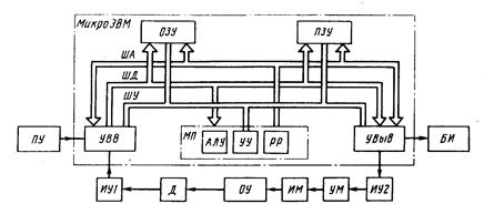 МикроЭВМ — вычислительная машина, представляющая собой совокупность микропроцессора МП, устройств ввода УВв и вывода У Выв информации, запоминающих устройств ОЗУ и ПЗУ,