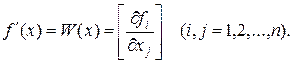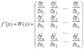 Из формул (9.5) и (9.6) вытекает, что под производной f ´(x) следует понимать матрицу Якоби системы функций f1, f2,…,fn относительно переменных x1, x2,…,xn, т.е.