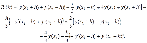 С(4) [а, b], аналогично тому как это делалось для формулы трапеций, выведем более простое выражение для R. Фиксируя среднюю точку х1 и рассматривая R = R(h) как функцию шага h (h≥0), будем иметь: