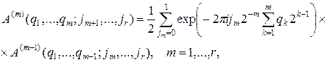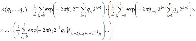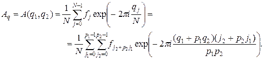 является составной частью решения многих задач. Непосредственное осуществление этих преобразований по формулам (21.4), (21.6) требует O(N2) арифметических операций. Рассмотрим вопрос о возможности сокращения этого числа операций; для определенности речь пойдет о вычислении коэффициентов Aq по заданным значениям функции. Идея построения алгоритмов быстрого преобразования Фурье опирается на то, что при N составном в слагаемых правой части (21.6) можно выделить группы, которые входят в выражения различных коэффициентов Aq.