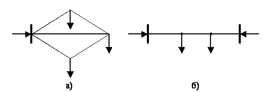 По конфигурации схемы сети различаются на разомкнутые и замкнутые. К разомкнутым относятся сети, образованные линиями, нагрузки которых могут получать электроэнергию только с одной стороны (см.рисунок 1.1). Замкнутыми сетями называются такие сети, по которым возможно осуществить электроснабжение потребителей не менее, чем с двух сторон (см.рисунок 1.2 а,б).