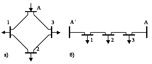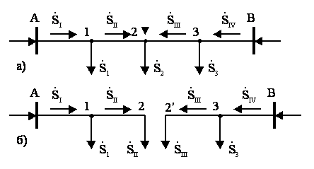 Точка 2 – точка потокораздела для активной мощности, а точка 3 – для реактивной мощности. В этом случае кольцевая сеть также условно разрезается по точкам потокораздела и представляется двумя разомкнутыми линиями (см.рисунок 4.7 б).