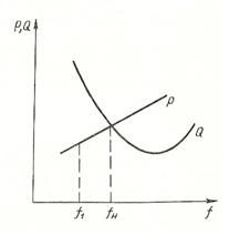 Если, например, уменьшить подачу энергоносителя (пара, воды) в турбину, то мощность ∑Рг станет меньше, и при той же нагрузке потребителей ∑Рн станет невозможным вращать двигатели с прежней скоростью. Они начнут тормозиться и в соответствии со статическими характеристиками нагрузки по частоте P = f (f) (см.рисунок 5.1) станут потреблять меньшую активную мощность. При этом наступит баланс активных мощностей при частоте f1, которая меньше первоначальной частоты fн.