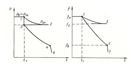 Рассмотрим характер изменения частоты при резких нарушения баланса активных мощностей (см.рисунок 5.2) Резкое снижение частоты происходит при внезапном выходе из строя генерирующей мощности и отсутствии резерва либо при аварийном отключении нагруженных межсистемных линий и разделение системы на несинхронные части с дефицитом мощности.