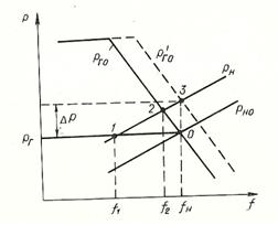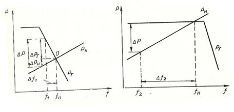 Рассмотрим процесс регулирования частоты, построив на одном графике характеристику регулятора скорости турбины Р = f(f) и частотную статическую характеристику активной нагрузки потребителей Рн = f(f)(см.рисунок 5.2).