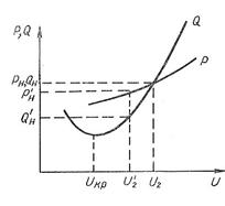 Если за счет разгрузки источника реактивной мощности снизить напряжение U1 до U1', то произойдет снижение напряжения в узле нагрузки U2 до U2'. При этом по статическим характеристикам мощность потребителей уменьшится до Pн' + JQн' (см.рисунок 5.9) и напряжение в конце линии