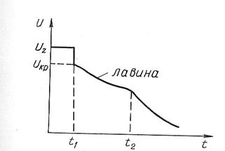 Регулирующий эффект нагрузки будет проявляться только до некоторого критического напряжения Uкр. Если напряжение U2 окажется ниже критического, то будет происходить обратное явление: снижение напряжения вызовет рост реактивной нагрузки потребителей, что приведет к росту потерь напряжения и дальнейшему снижению напряжения U2. Наступает лавина напряжения и происходит нарушение баланса реактивной мощности (см. рисунок 5.11). Здесь t1- момент снижения напряжения до Uкр, а интервал времени t2 – t1 процесс развития лавины (несколько секунд). В результате лавины напряжения происходит нарушение устойчивости нагрузки, которое выражается в саморазгрузке потребителей. После их отключения напряжение восстанавливается.